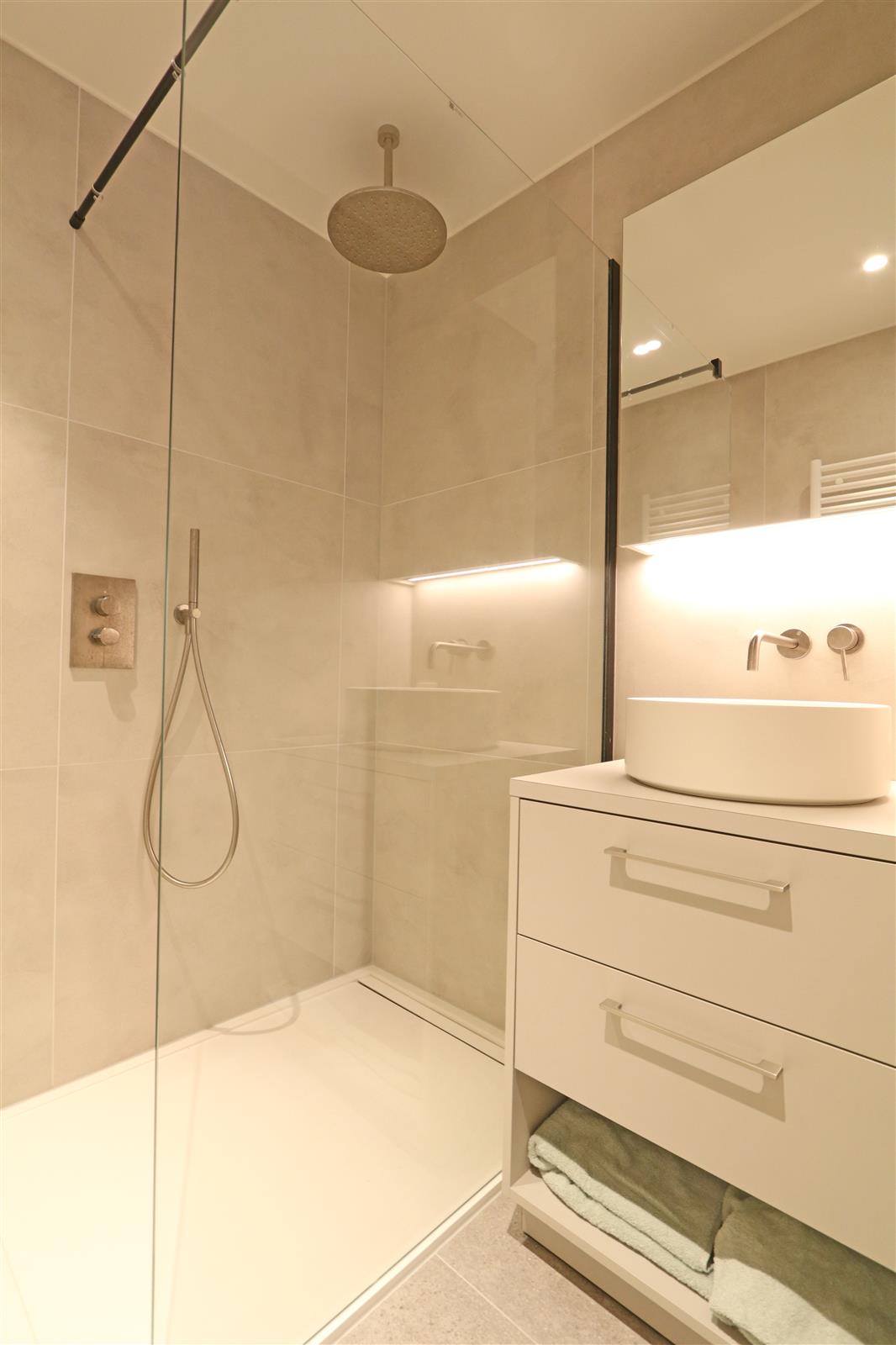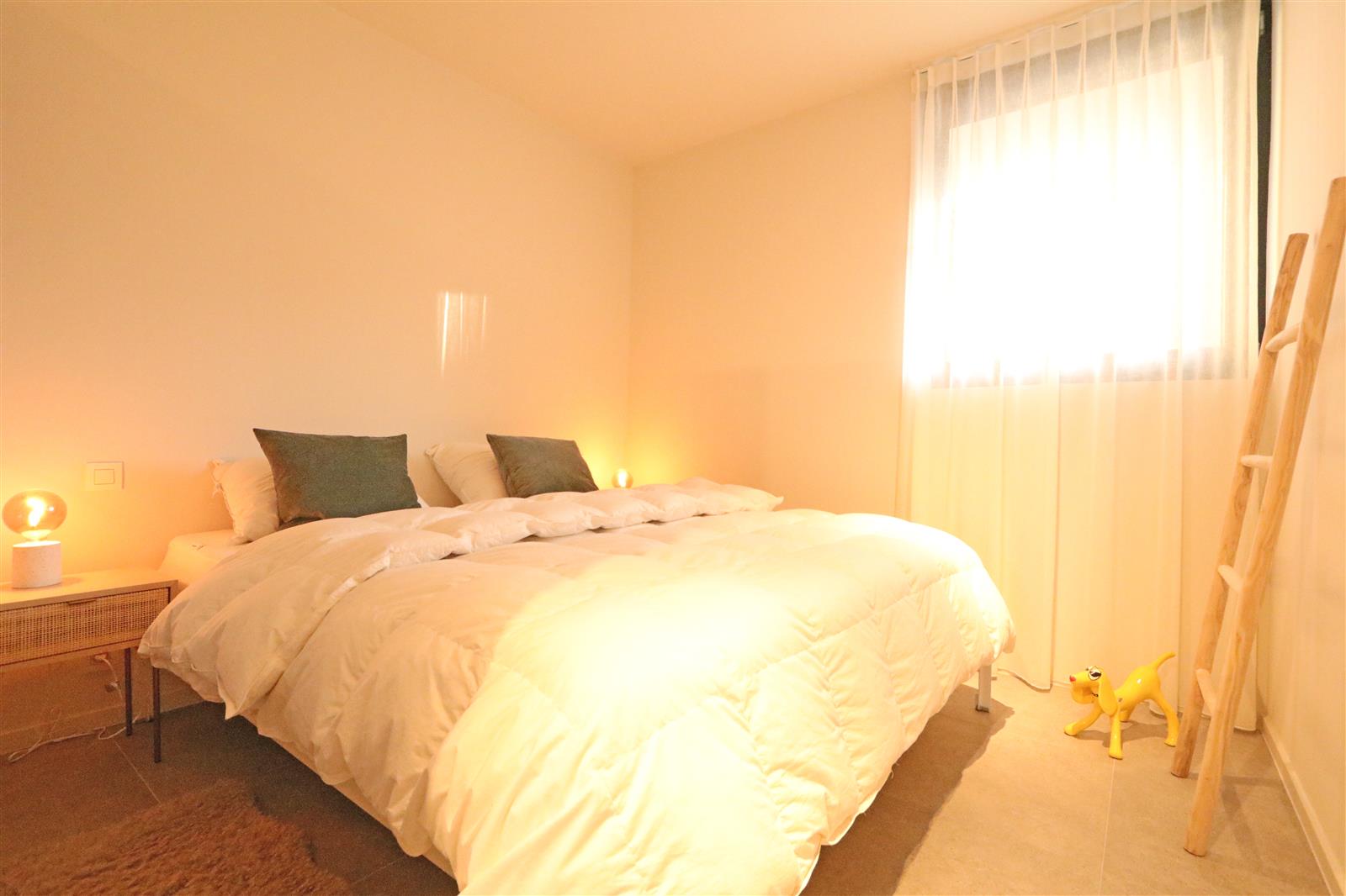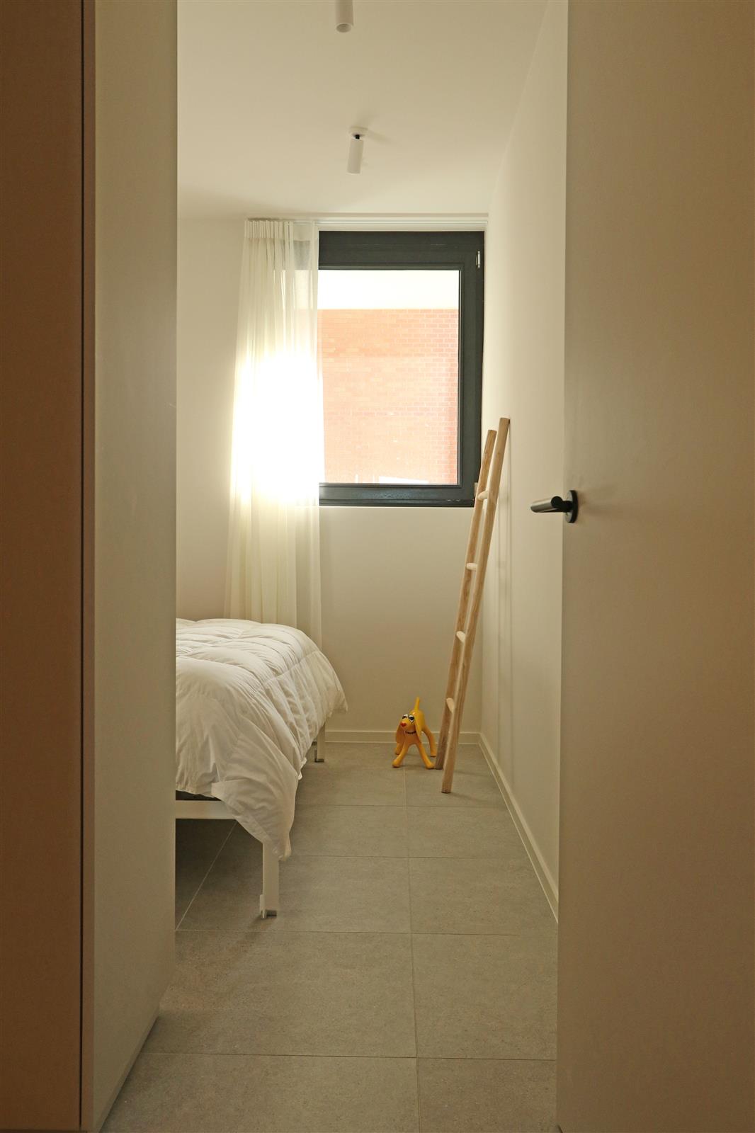 Appartement neuf et moderne avec une chambre double disposant d’une salle de bains attenante avec lavabo, douche à l’italienne et toilettes. Il y a une deuxième chambre avec un lit superposé et un bureau, ainsi qu’une deuxième salle de douche.