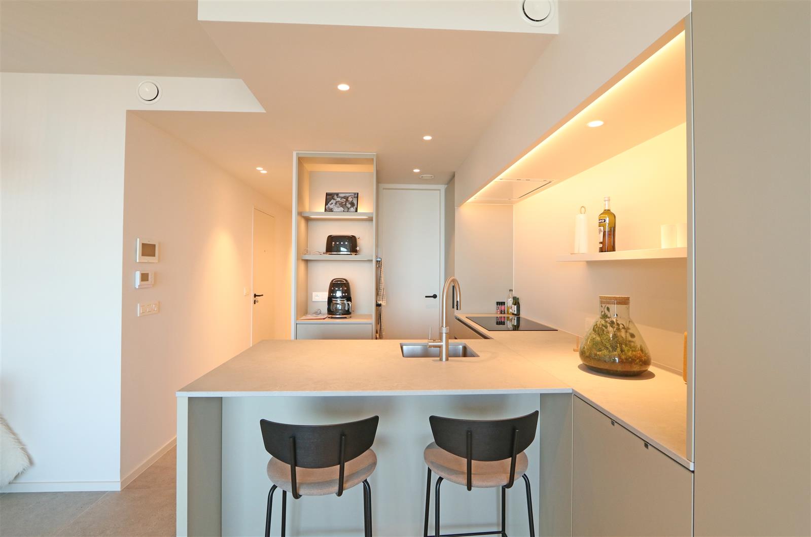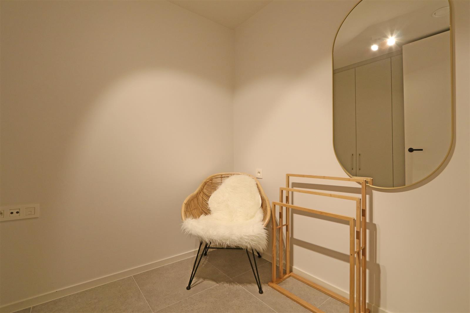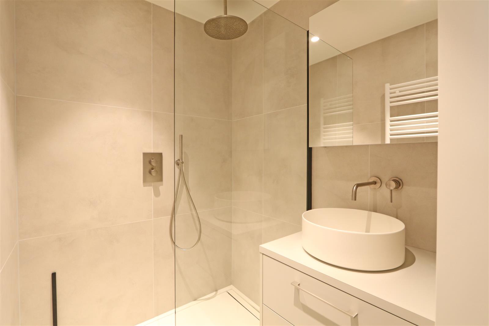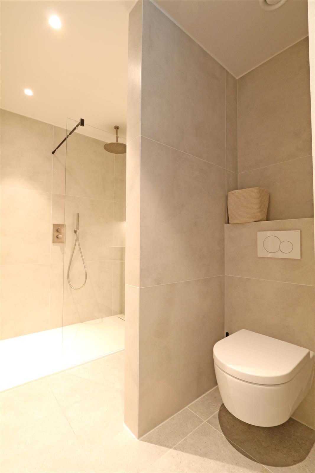 Appartement neuf et moderne avec une chambre double disposant d’une salle de bains attenante avec lavabo, douche à l’italienne et toilettes. Il y a une deuxième chambre avec un lit superposé et un bureau, ainsi qu’une deuxième salle de douche.